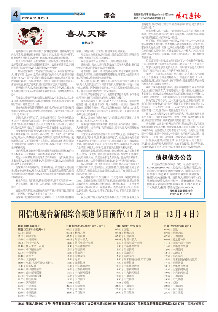 阳信电视台新闻综合频道节目预告(11月28日—12月4日)