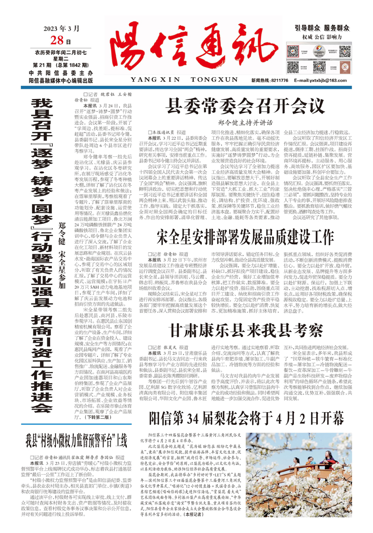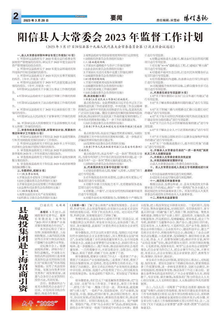 阳信县人大常委会2023年监督工作计划 (2023年3月17日阳信县第十九届人民代表大会常务委员会第12次主任会议通过)