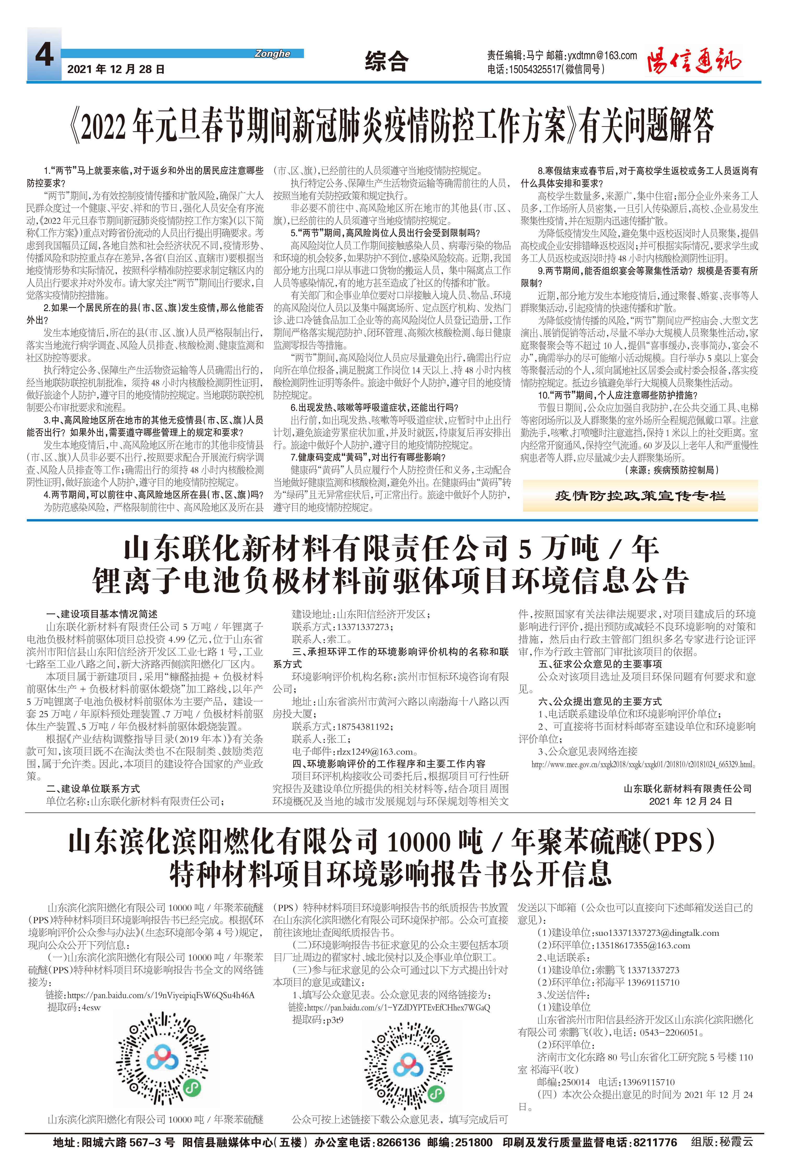 山东滨化滨阳燃化有限公司10000吨/年聚苯硫醚(PPS) 特种材料项目环境影响报告书公开信息