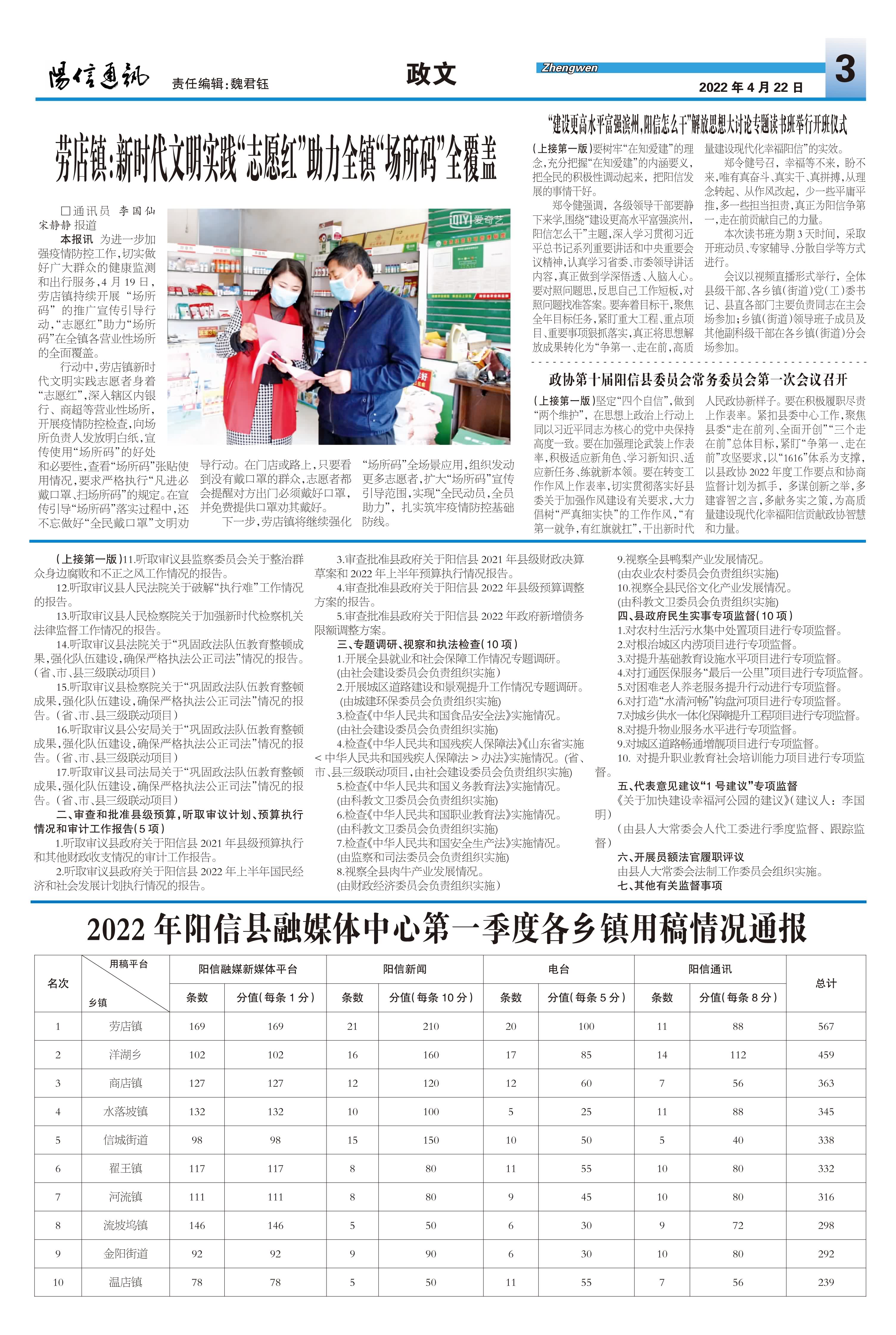 2022年阳信县融媒体中心第一季度各乡镇用稿情况通报