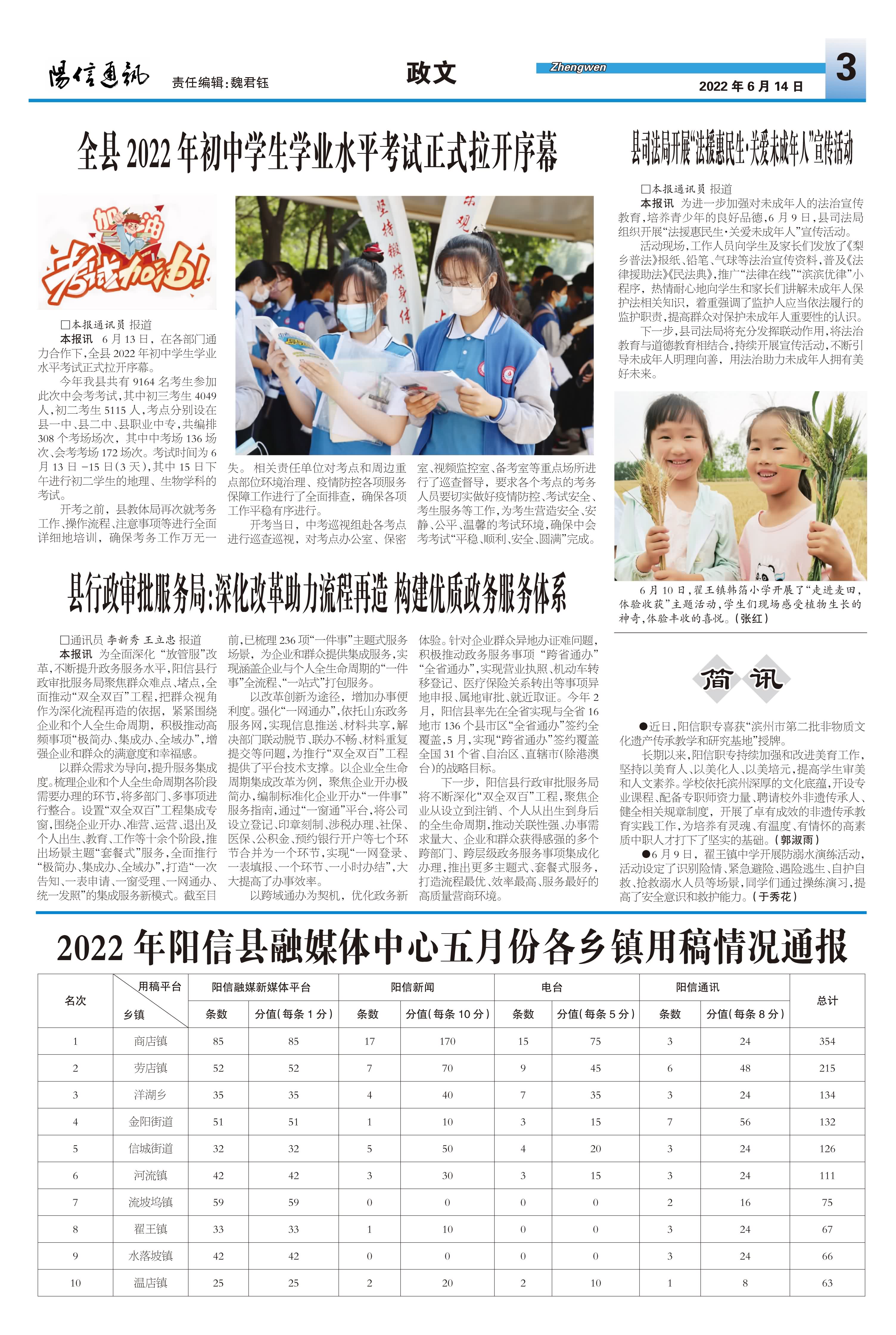 2022年阳信县融媒体中心五月份各乡镇用稿情况通报