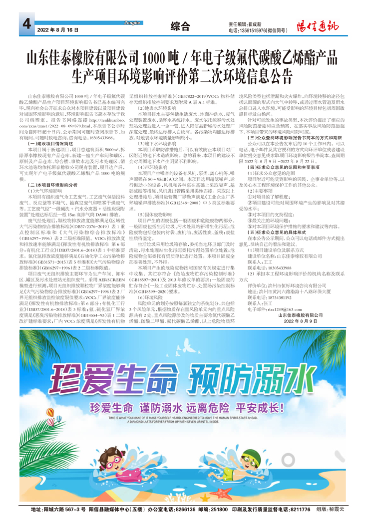 山东佳泰橡胶有限公司1000吨/年电子级氟代碳酸乙烯酯产品 生产项目环境影响评价第二次环境信息公告
