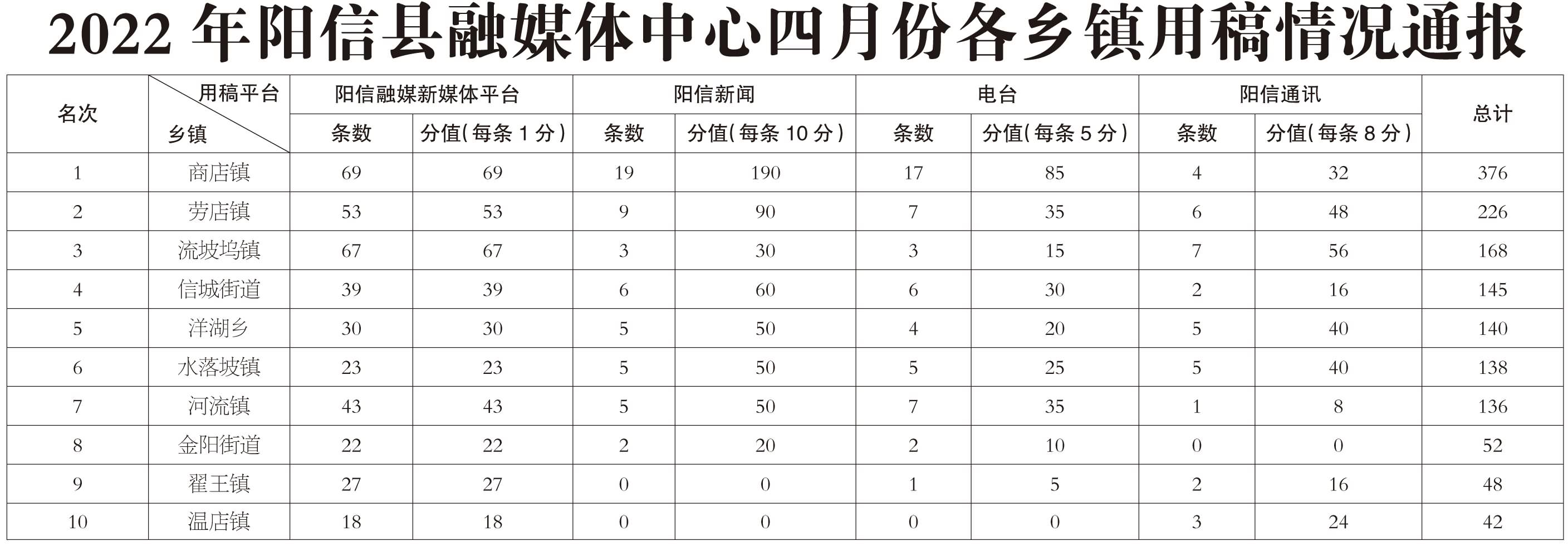 2022年阳信县融媒体中心四月份各乡镇用稿情况通报