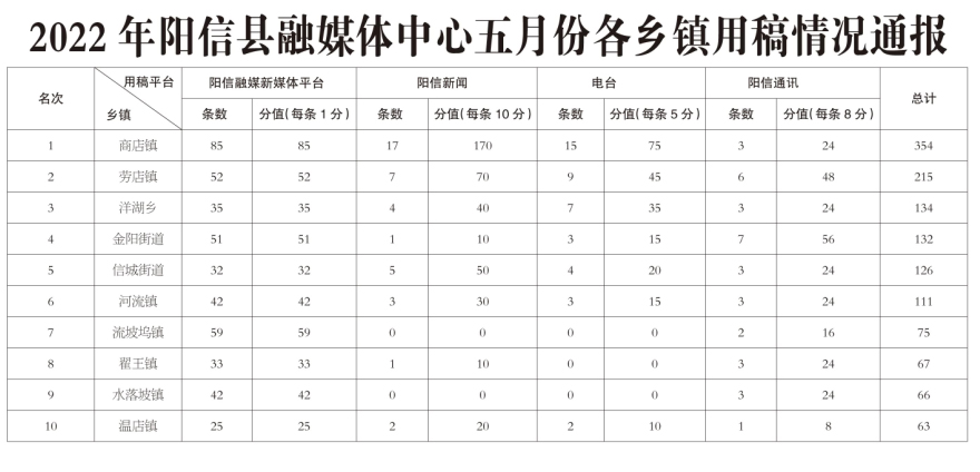 2022年阳信县融媒体中心五月份各乡镇用稿情况通报