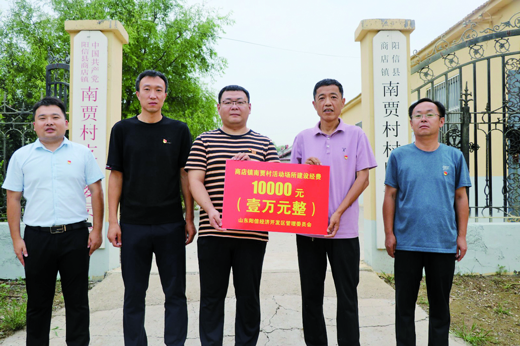 7月23日,阳信经济开发区选派驻商店镇南贾村第一书记司建磊将单位帮扶的一万元款项送到商店镇南贾村党支部书记贾秀坤的手里,用于村级活动场所规范提升。 (董颖颖 赵文岐)