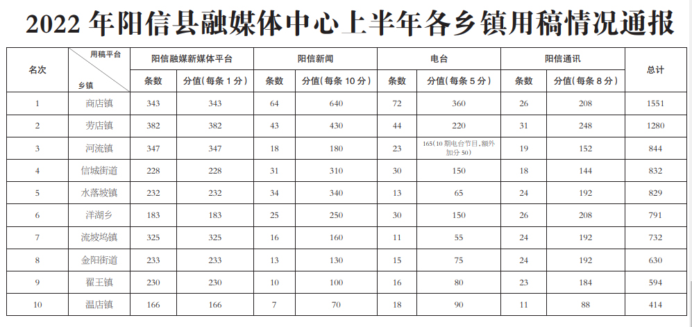 2022年阳信县融媒体中心上半年各乡镇用稿情况通报