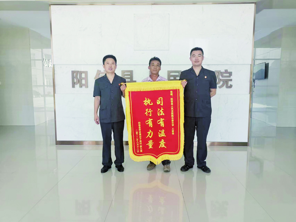 本报讯 “感谢执行的法官为我追到了欠款,给我讨回了公道。”近日,侯某将一面绣有“司法有温度 执行有力量”的锦旗送到阳信法院法官手中,对他们认真负责的办案精神表示感谢。