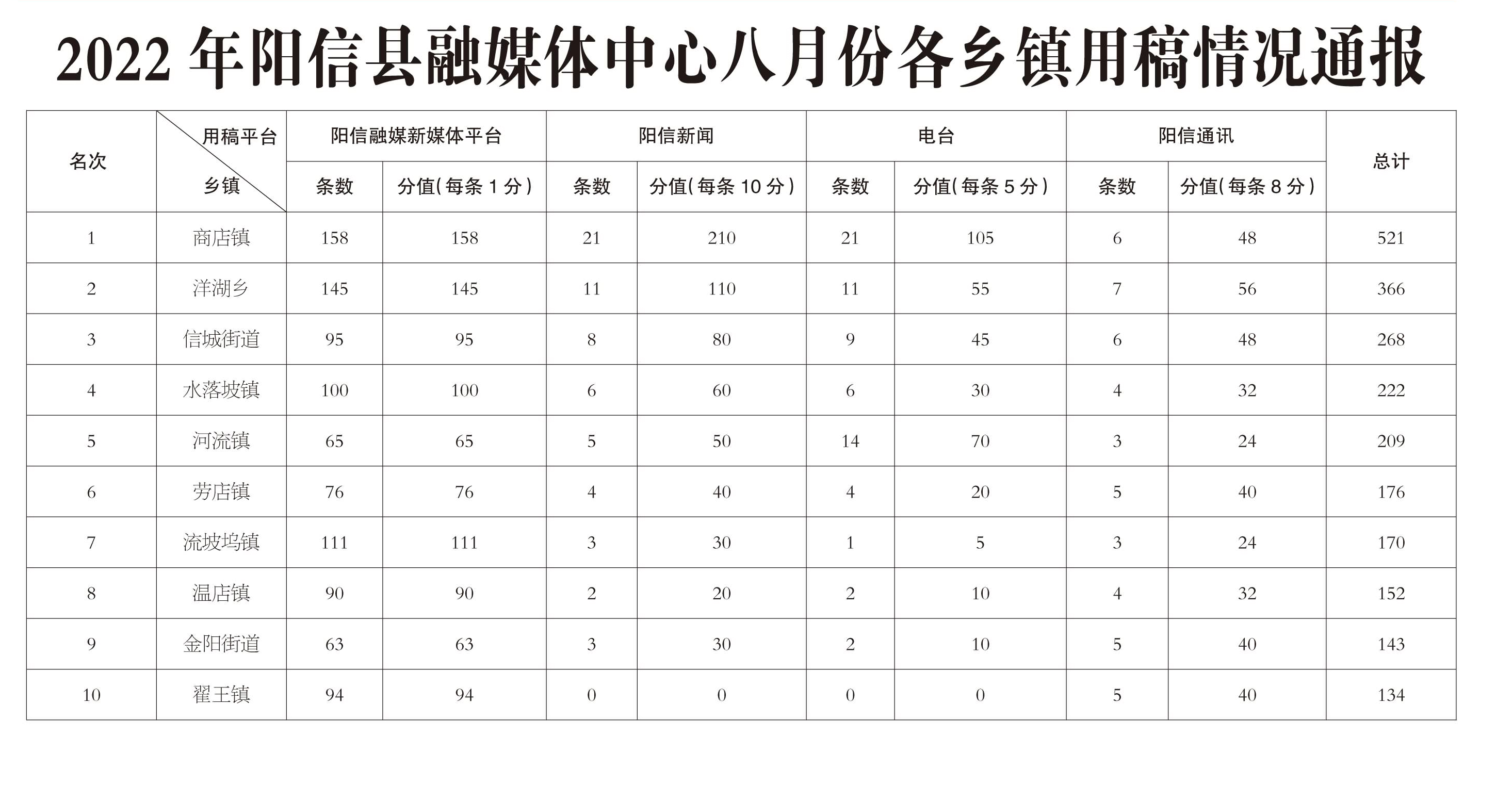 2022年阳信县融媒体中心八月份各乡镇用稿情况通报