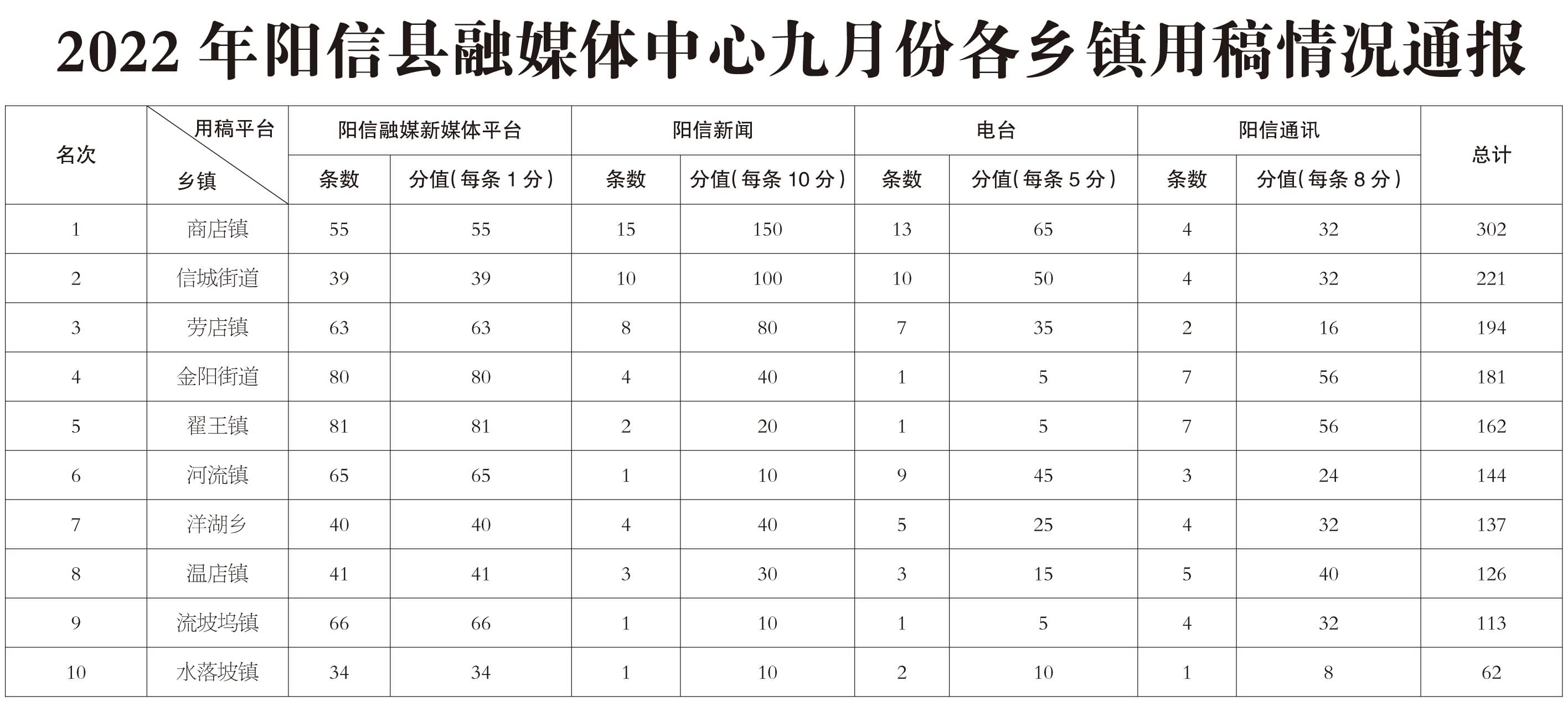 2022年阳信县融媒体中心九月份各乡镇用稿情况通报