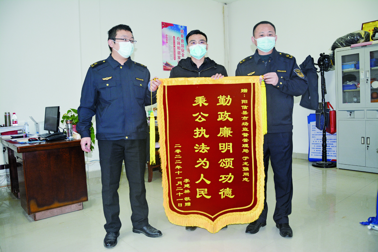 11月21日,消费者李建林将一面写有“勤政廉明颂功德,秉公执法为人民”的锦旗送到市场监管局信城所,以表达自己的感谢之情,感谢他们及时解决了产品质量纠纷,挽回损失,维护了消费者利益。(翟成新 王国贤)