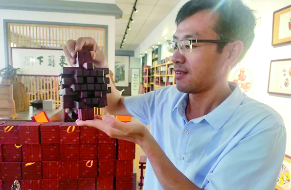 郭新泽告诉记者,艺术木雕的价值就在于它的艺术性,一点都马虎不得的。做出毛坯后,还得反复打磨修饰细部,直到完美无瑕才行。郭新泽还给记者进行了现场演示,只见他用工具一点一点进行打磨,雕出木条的凹凸结构,然后进行拼接,组合成“平安锁”,这样一件榫卯结构的“平安鲁班锁”就完成了。郭新泽介绍,“平安鲁班锁”是他在2019年创作的,现在已经申请了国家专利。“平安鲁班锁”有34根红花梨木拼插起来,四面呈现“平安”字样,整件作品使用榫卯结构,“平安鲁班锁”,寓意平安吉祥,产品供不应求。