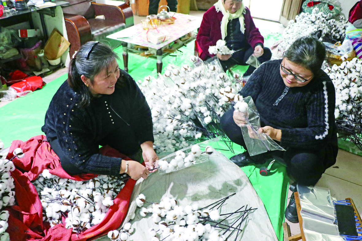 本报讯 走进商店镇兴商村一农户家中,像是走进了棉花地,雪白的棉花“开”满了房间,一群妇女好似在“摘拾”棉花。但这不是真棉花,也不是人在这里拾棉花,而是人工在用一些仿真的原料制作工艺品—棉花花,产品销往国内外市场。