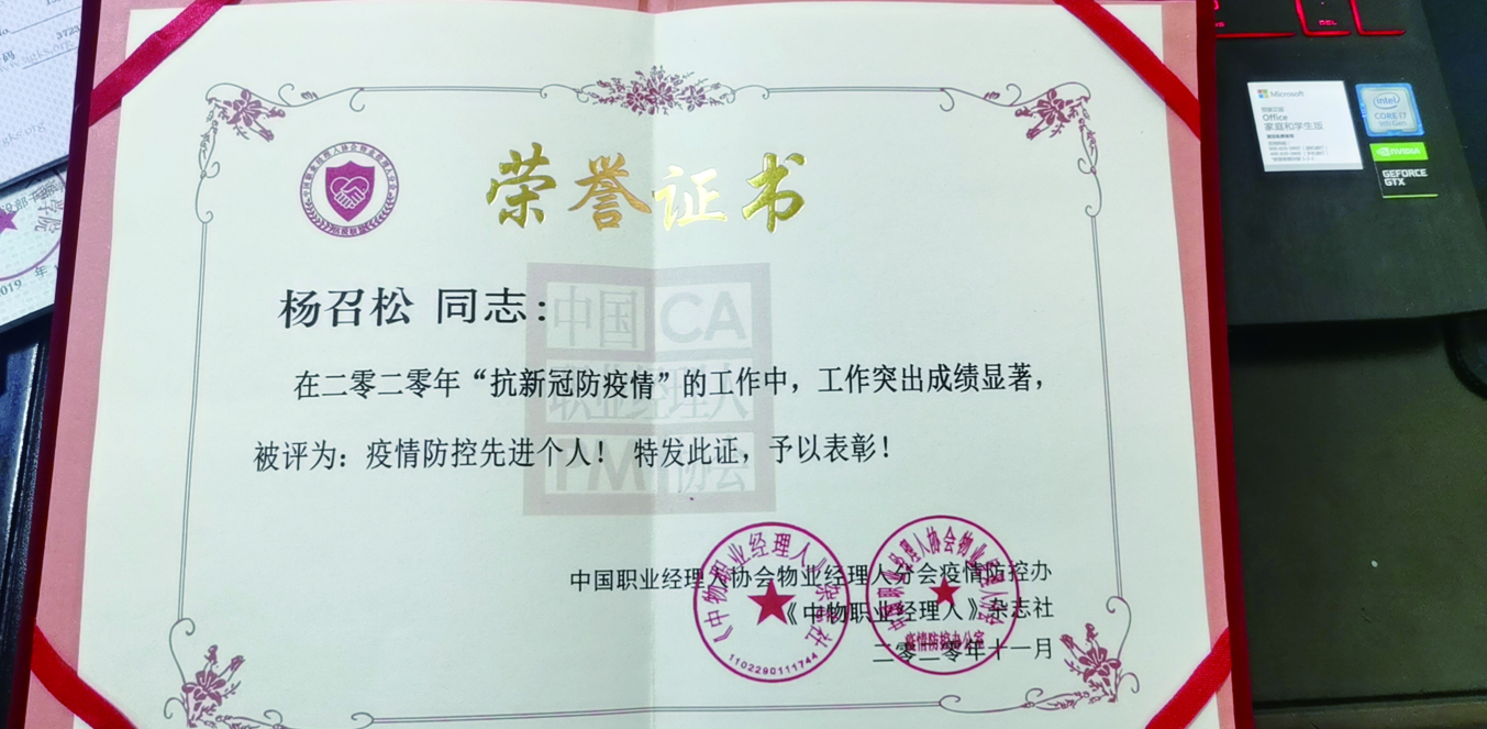 山东省阳信春晖物业管理有限公司被中职协物业经理人分会评为“疫情防控先进集体”等荣誉。总经理杨召松同志被中职协物业经理人分会评为“疫情防控突出个人”。