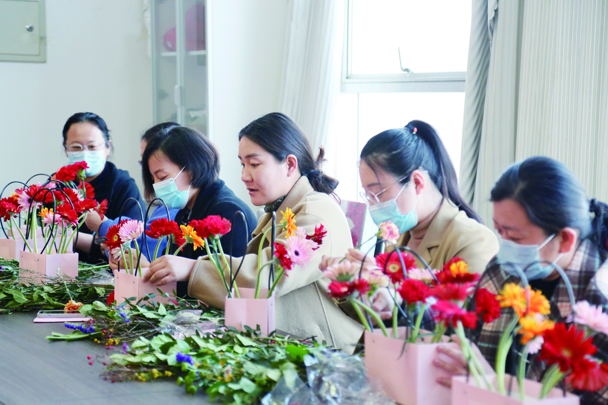 本报讯 在“三八”妇女节来临之际,为丰富街道女职工的业余文化生活,3月7日,信城街道在幸福社区新时代文明实践站开展“‘三八’迎春到 巾帼如花笑”及廉洁家风为主题的庆“三八”插花活动。