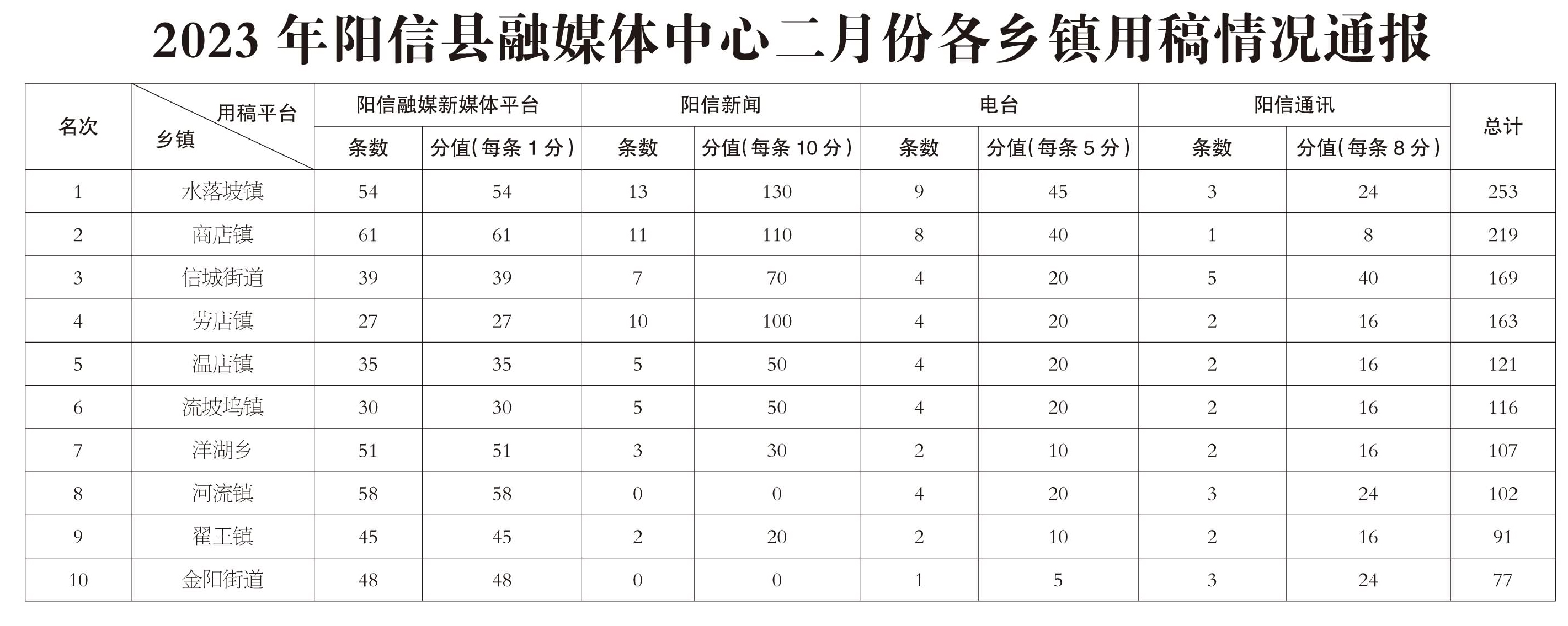 2023年阳信县融媒体中心二月份各乡镇用稿情况通报