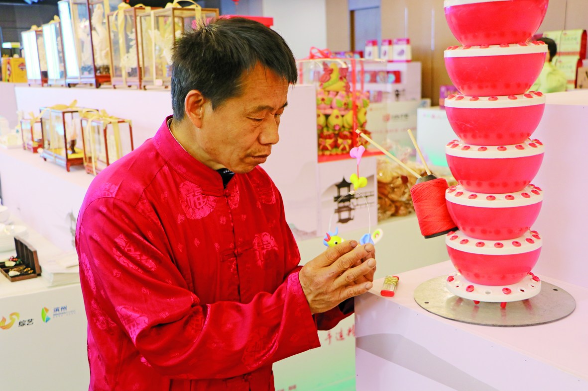 山东手造精品展上,鲁班锁、木雕、蛋雕、鲁绣、海瓷、面塑、花馍、剪纸、羊角蜜、牛骨雕刻、糖画等100余种非遗作品进行现场展销,游客可以现场近距离感受体验非遗,与传承人进行互动交流。一批批手造精品、一个个手造企业在精品展上大放光彩,展现着齐鲁文化生生不息、创意创新的鲜活力量。