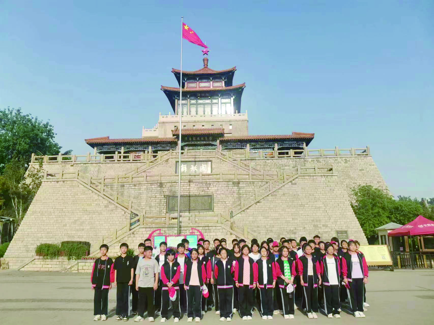 站在巍峨的解放阁前,陈毅元帅题写的“解放阁”牌匾格外庄严肃穆。全体师生整齐列队,齐唱国际歌,深切缅怀革命先烈的丰功伟绩,表达对革命先烈的无限敬仰和哀思。