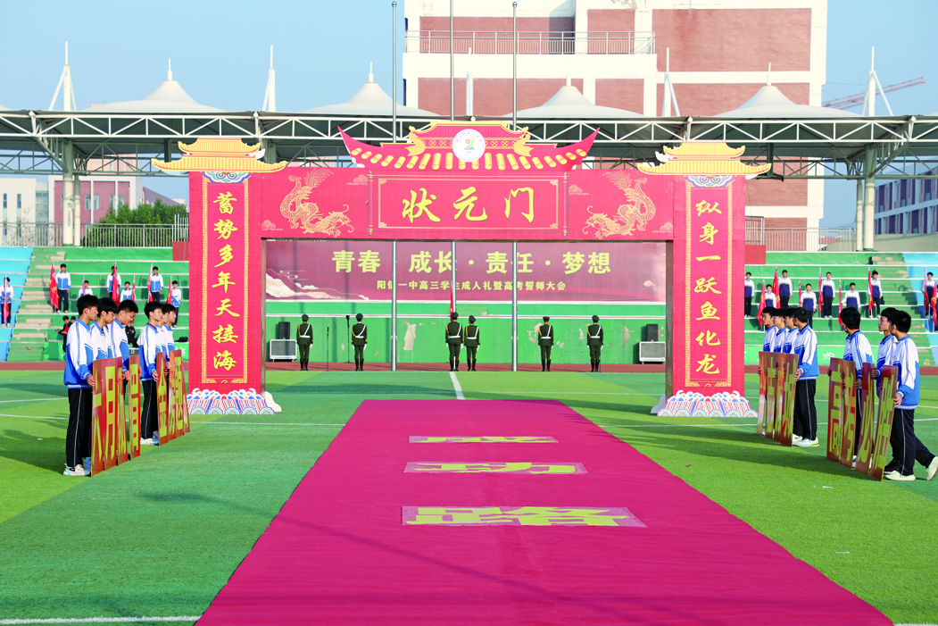 雄鹰展翅搏长空,蛟龙跃水战风浪。高三年级主任韩永义带领高三师生庄严宣誓:“十年寒窗,今朝绽放。积极向上,自信自强。六月沙场,誓把名扬。弓已搭箭,百步穿杨!展卷挥毫,决胜考场!旗开得胜,名题金榜。全力以赴,斗志昂扬;一中高考,定创辉煌!”声声呐喊响彻云霄,展示一中学子奋战高考的信念和高考必胜的决心。
