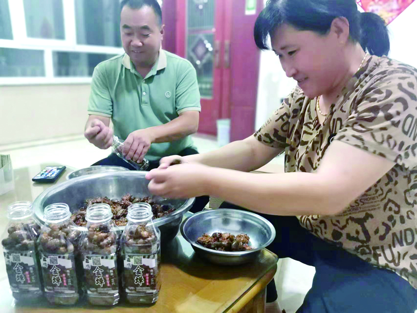 刘新建说,枝条悬挂好后要等到次年的6、7月份才能孵化出蝉苗,在这期间,刘华芹会不时地翻看枝条,查看枝条的干湿度,并根据天气和温度,不定期给枝条喷水,来提高蝉苗的孵化率。“到了6、7月份,我们在悬挂的枝条下边接好布,在枝条上喷水让蝉苗落下,然后收集分装,让客户来取。”刘华芹说。在取蝉苗之前,刘新建会提前告知客户要浇地、松土、杀蚁,这样客户取回蝉苗后就可以直接撒在地里,等待两年后,金蝉就可以出土。