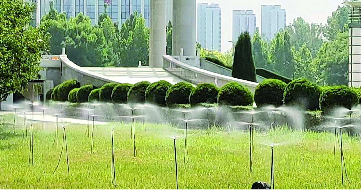 本报讯 近日,在河东三路两侧绿化带内,一个个自动喷淋系统开启作业,形成的雨雾既能够滋润花草树木,让绿植保持盎然的生机,同时又能起到防尘和降温的共赢效果。