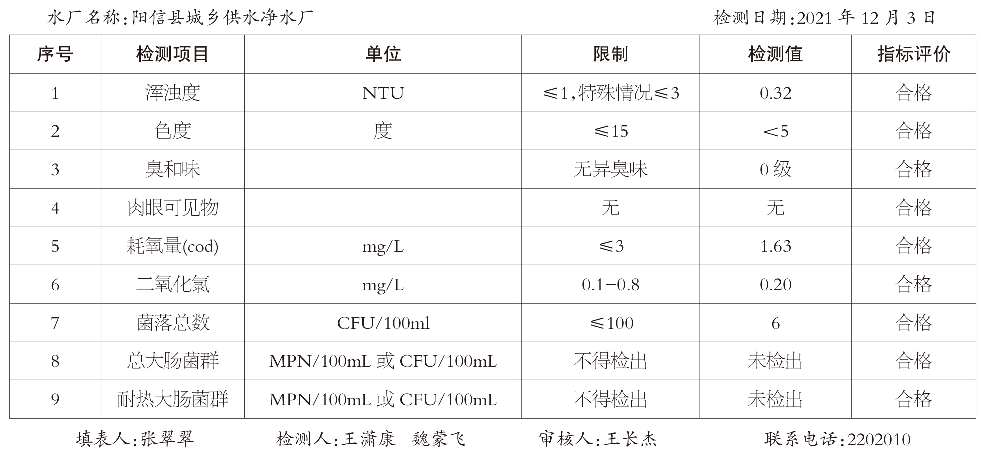 阳信县第一自来水公司出厂水9项指标监测表
