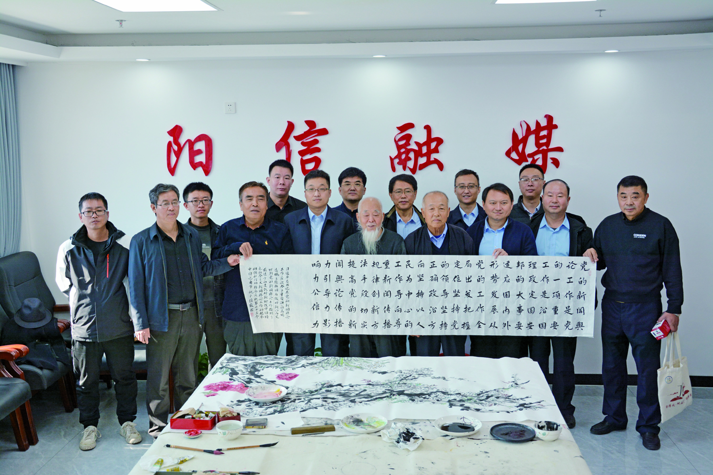 11月7日,为深入实施全市“17个起来”宣传行动,书写大美风物,弘扬时代精神,热烈庆祝第24个中国记者节,喜迎第十六届中国牛业发展大会胜利召开,阳信县委宣传部、县文联、社科联、阳信农商银行、畜牧局、行政审批服务局、融媒体中心和县美术家协会、书法家协会、科普美协联合举办了“风物写起来”庆祝第24个中国记者节.喜迎第十六届中国牛业发展大会走进融媒体中心文艺志愿服务活动。