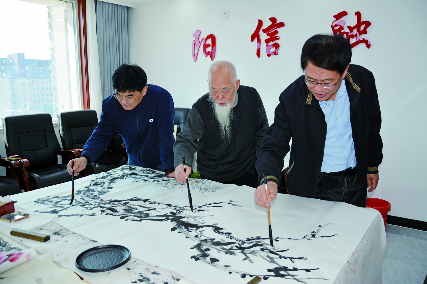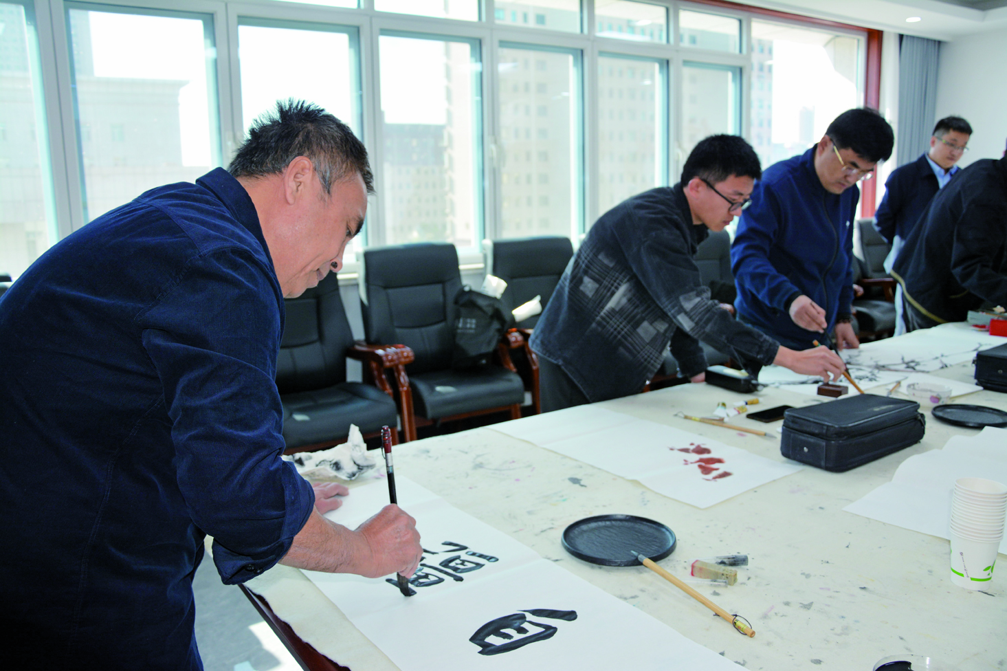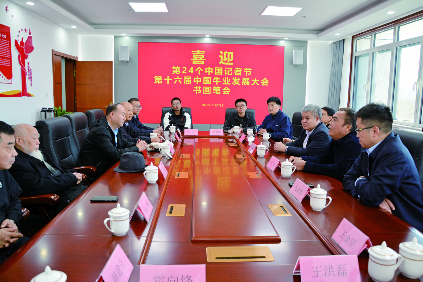 在文艺志愿服务书画笔会现场,老中青三代书画家志愿者或挥毫泼墨,或奋笔疾书,大家以高昂饱满的热情,用中华传统笔墨表现形式,表达了对庆祝第24个中国记者节、喜迎第十六届中国牛业大会胜利召开的衷心祝福。