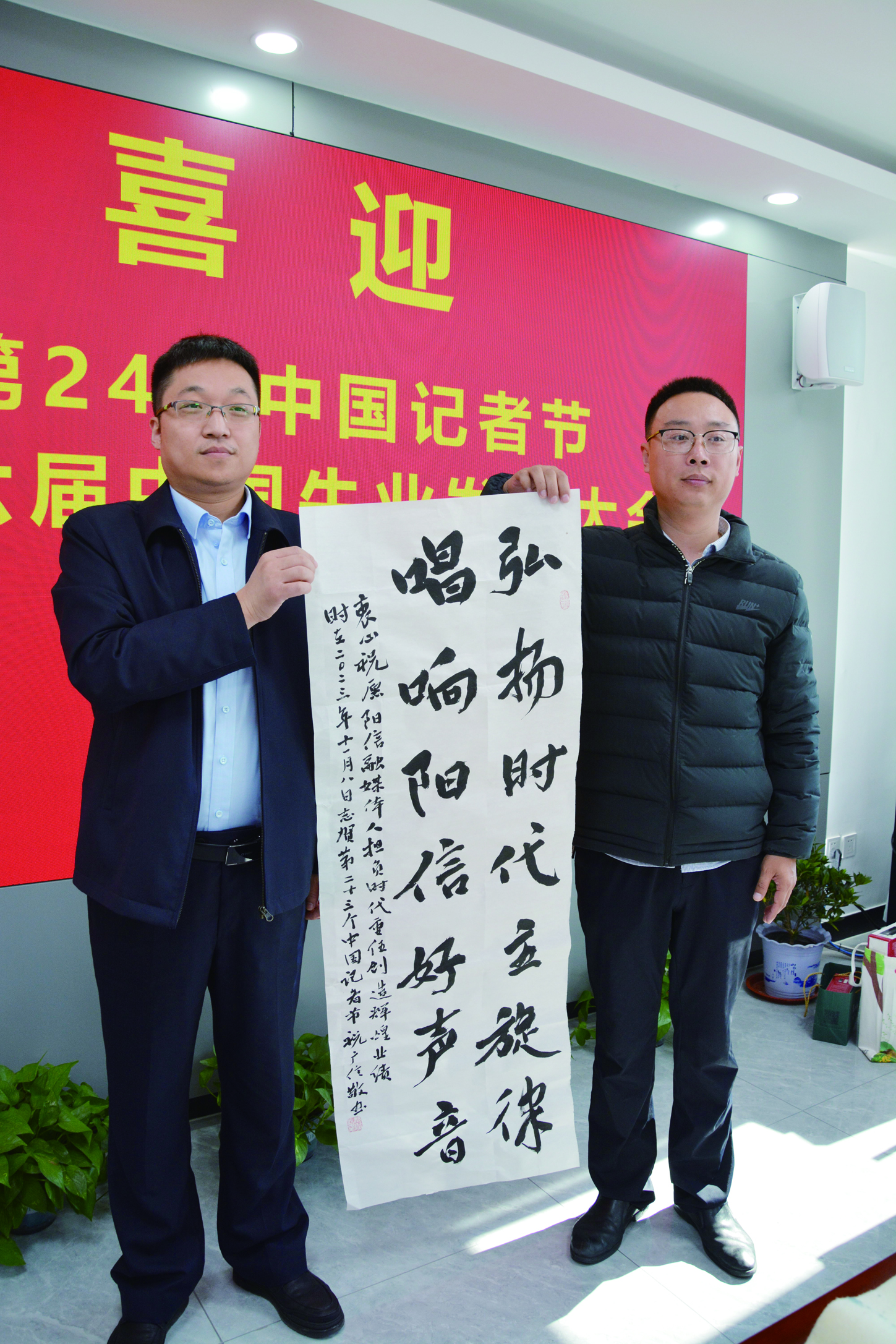 中国美术家协会会员韩强和其他书画家联合创作的《梨园牧春图》,描绘了梨花盛开园田放牧的早春景色,可谓小中见大美不胜收。“弘扬时代主旋律,唱响阳信好声音”“大美梨乡迎盛会,牛县展雄风”“牛县牛企兴牛业,盛世盛会溢盛情” “牛业大会谋振兴伟业,阳信融媒发时代强音”等书法作品,热情赞颂大美梨乡,大力褒扬牛县,为庆祝第24个中国记者节、喜迎第十六届中国牛业发展大会,营造了浓厚热烈的节日气氛。