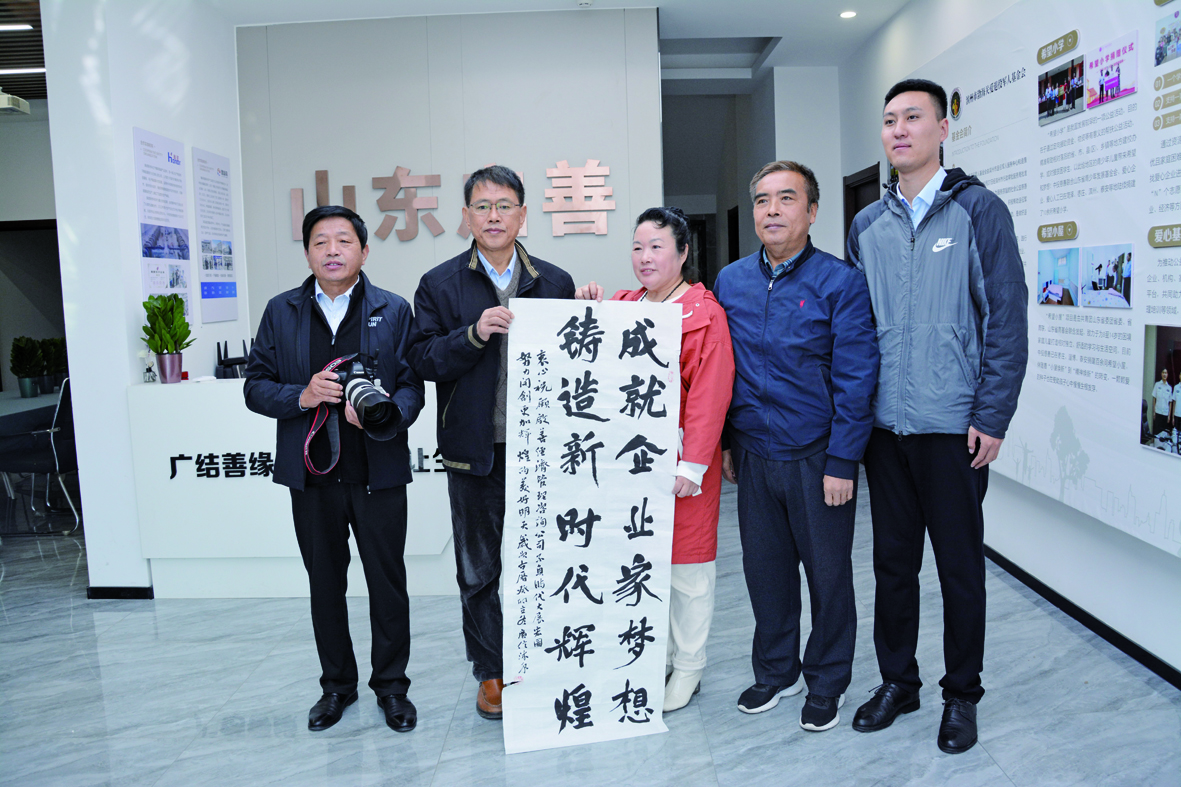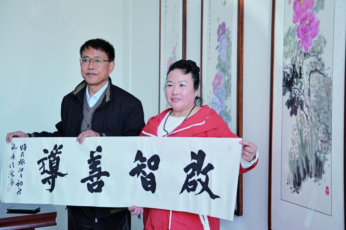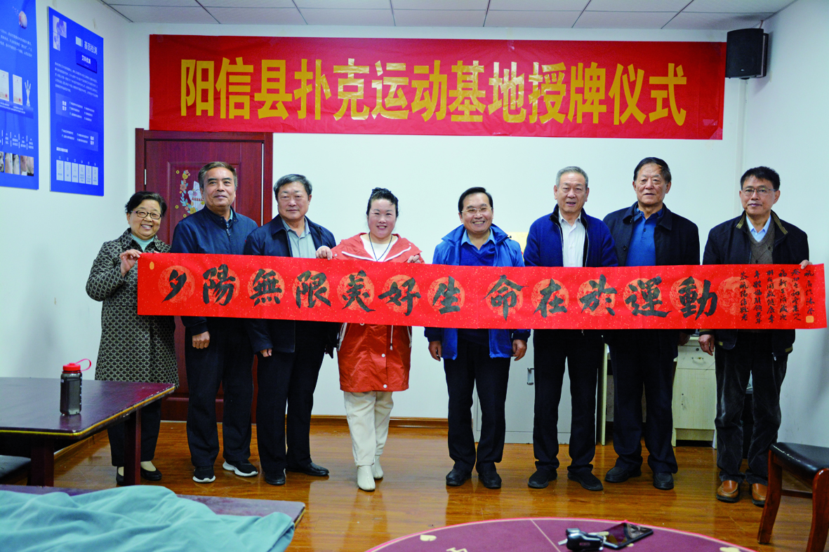 阳信县书法家协会和滨州市科普美协阳信分会向县老年体协和扑克运动基地现场赠送了“夕阳无限美好,生命在于运动”“风物写起来,老年动起来,扑克打起来”等书画作品。