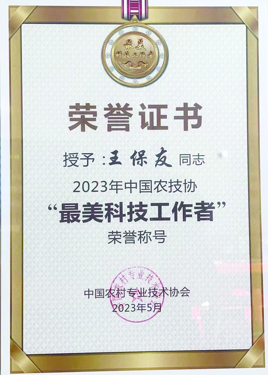 5月23日,中国农村专业技术协会举办的2023年中国农技协“最美科技工作者”评选揭晓,全国22名同志被评为“最美科技工作者”荣誉称号,王保友被评为山东省唯一的全国“最美科技工作者。”