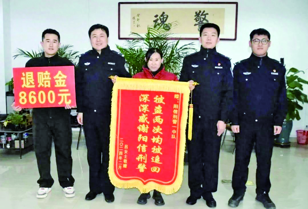 原来,吕女士曾在去年被盗过一台笔记本电脑,同样是刑侦大队一中队民警及时破案并返还的。当日下午,吕女士将一面写有“被盗两次均被追回 深深感谢阳信刑警”的锦旗送到了办案民警的手中。