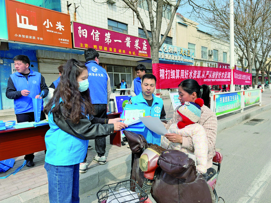 做好线下宣传。节水志愿者们通过悬挂宣传横幅、张贴节水宣传海报、发放节水宣传资料、面对面讲解等方式向市民宣讲阳信县水情,普及节水常识,倡导科学用水,鼓励大家积极参与节水型社会建设,增强节约水、爱护水、珍惜水的意识。
