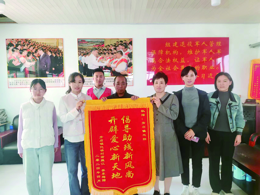 本报讯 近日,代镇村谢振江手持一面“倡导助残新风尚 开辟爱心新天地”的锦旗送到劳店镇残联,以此表达最诚挚的感谢。