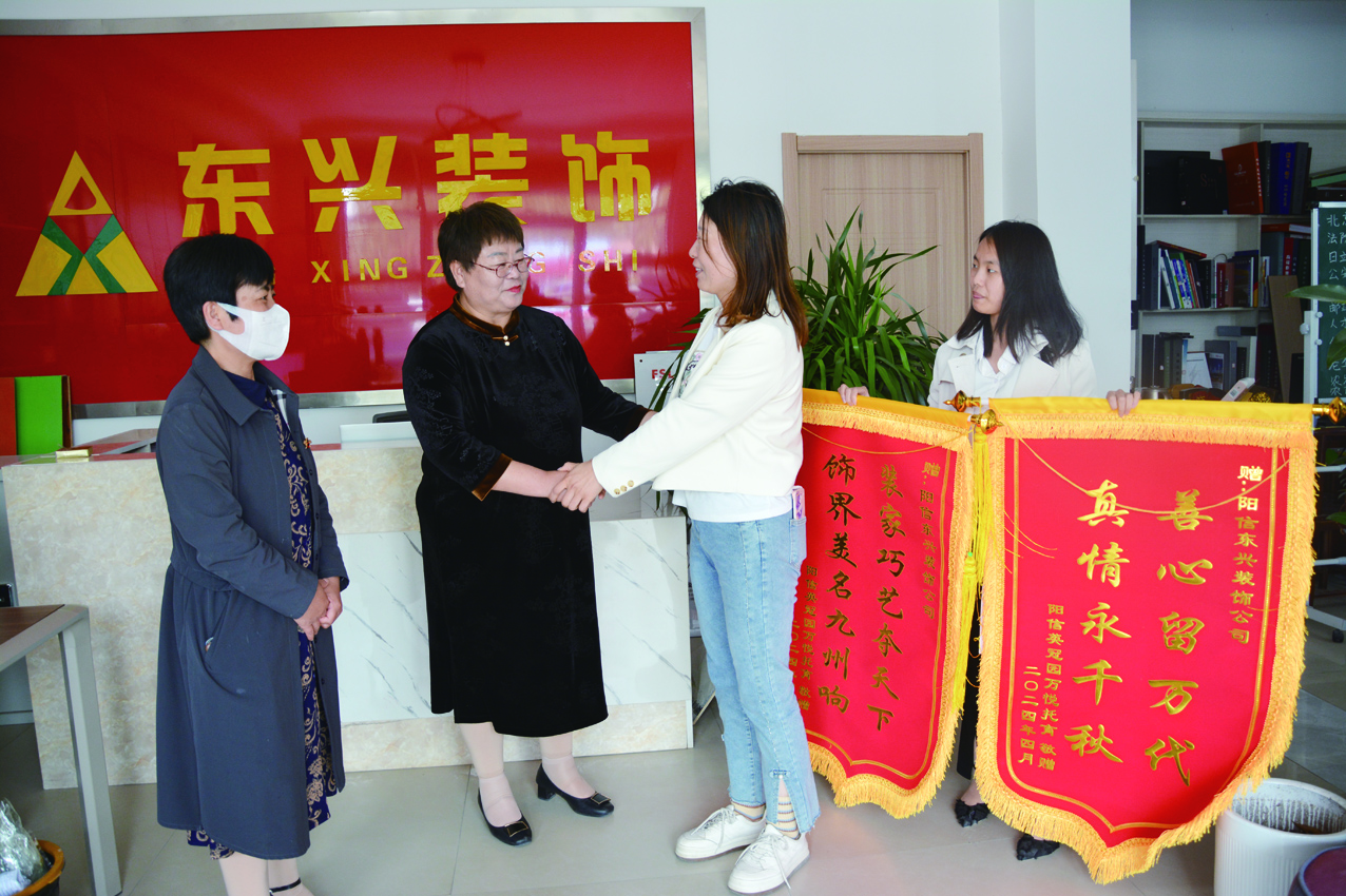 4月28日,阳信县万悦托育服务有限公司英冠幼儿园园长赵芳荣将两面写有“善心留万代、真情永千秋”“装家巧艺夺天下、饰界美名九州响 ”的锦旗送到阳信县东兴装饰有限公司全案设计总监裴金丽手中,以感谢公司在自己困难时伸出援手,助力自己二次创业。