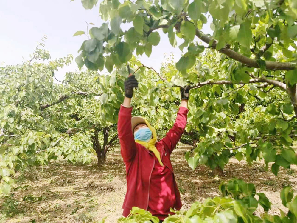 “我们四合新村有上百年种植梨树历史,种植面积可达千余亩,被成为‘千亩梨园’,主要有皇冠、7号、秋月等优质梨树品种,每年可产梨5000余吨。我们村成立了果树种植专业合作社,不但为果农实现增收,也为附近村的群民带来就业机会,现下正是疏果的关键时期,千亩梨园疏果工作量极大,每家每户都会雇用不少疏果工。”顺着合作社负责人商进军手指的方向,三五个疏果工正忙碌的疏剪梨果中。“在这里一天能挣130元左右,离家近,时间也自由,既能顾家还能赚钱。主要活基本不断,疏花、除草、疏果、打药、摘果、剪枝等,从春天到秋天基本上闲不着啊。”在梨园干活的附近村民王大姐一边干活一边高兴地说道。