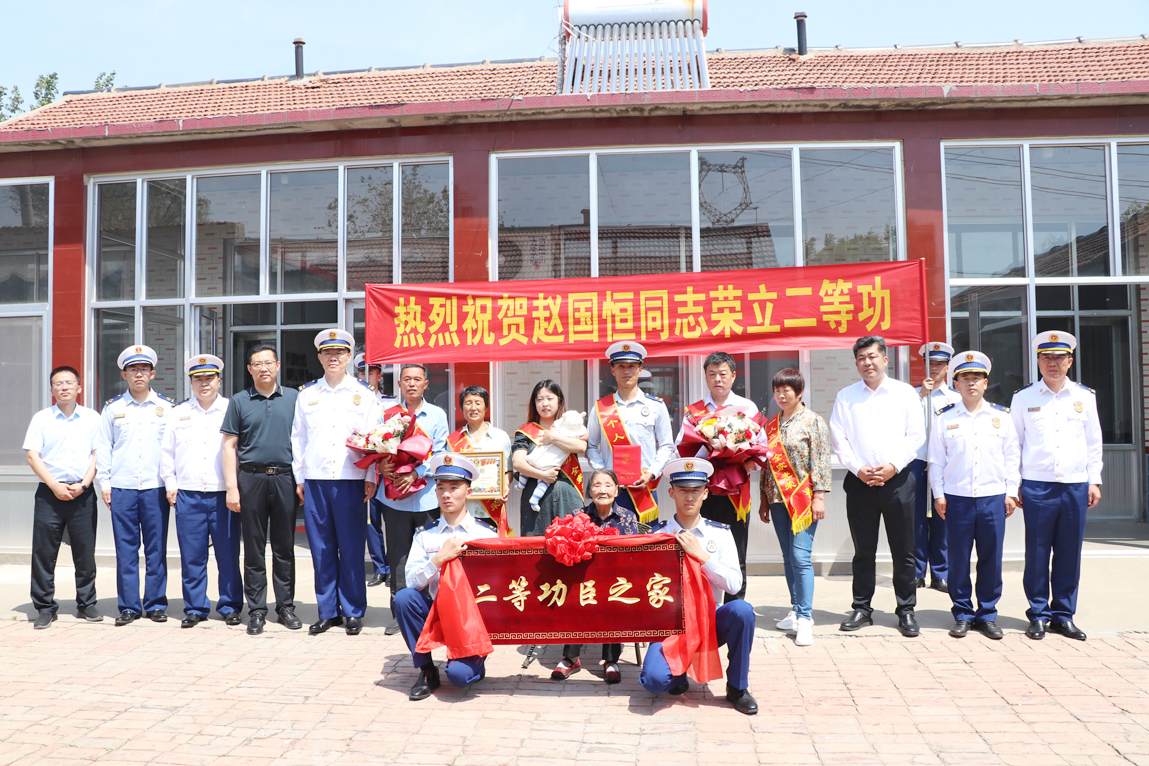 本报讯 近日,滨州市消防救援支队政治委员张鑫,县领导李华伟、赵泳专程到商店镇新安村赵国恒家中,为二等功臣赵国恒家庭送上立功喜报,并颁发“二等功臣之家”牌匾。