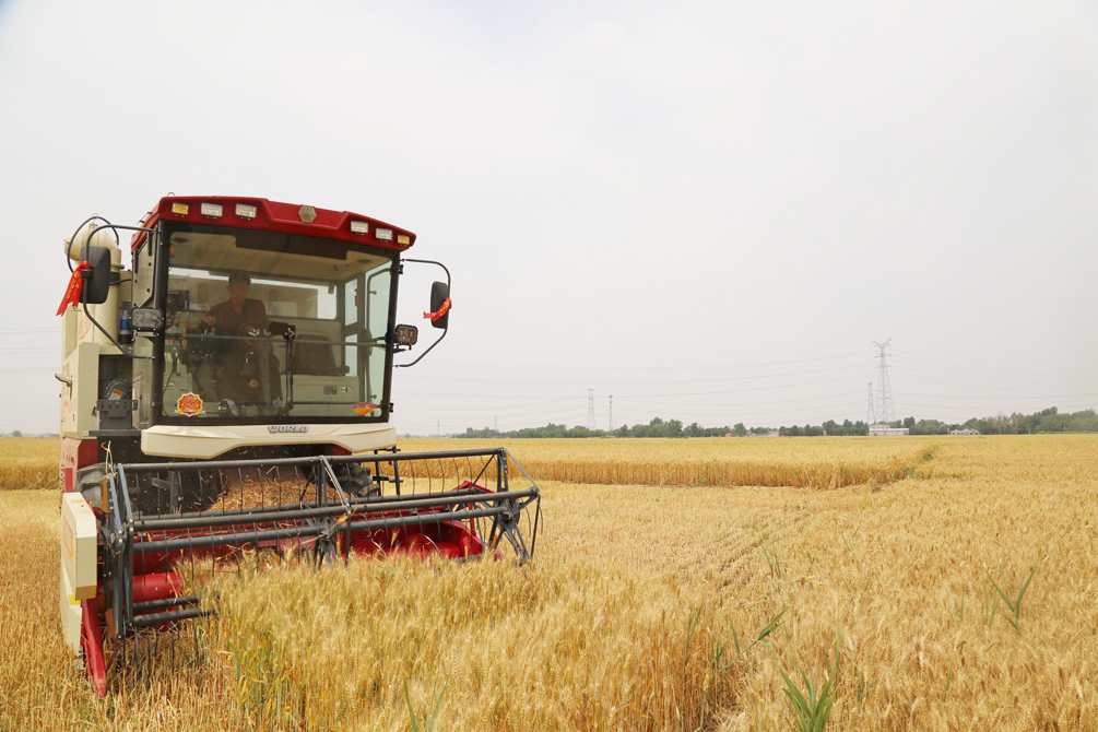在洋湖乡西冯村,收割机在金黄色的麦田里来回作业,随着收割机轰隆隆驶过,高高的麦秆变成了饱满的麦粒,随后从出粮口倾泻而下,满目金黄,农民脸上洋溢着丰收的喜悦。