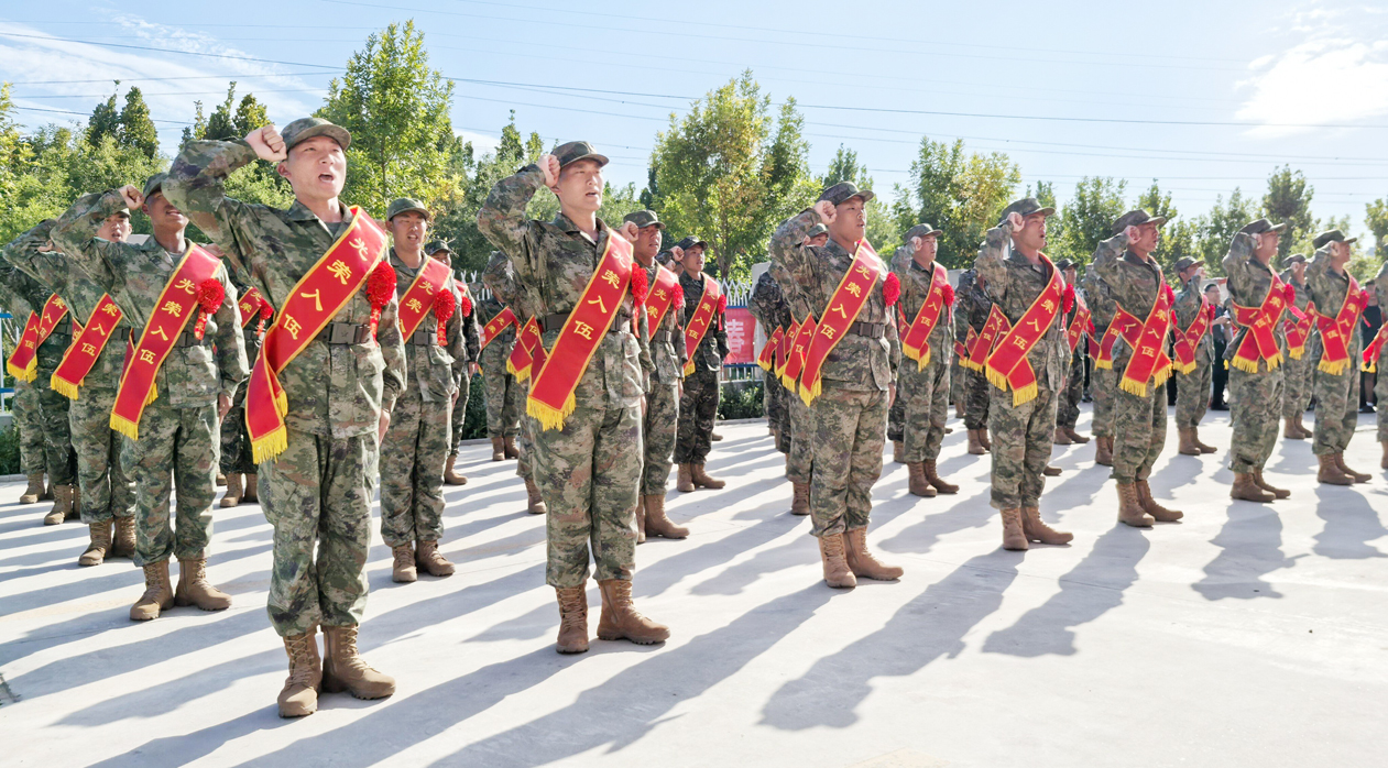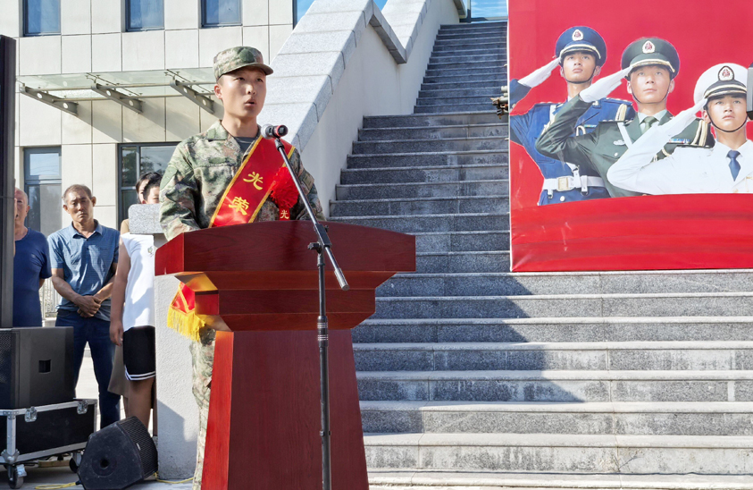 活动现场,入伍新兵身着戎装,披绶带,戴红花,精神抖擞,英姿飒爽,褪去了学生的稚嫩,增添了战士的坚毅。