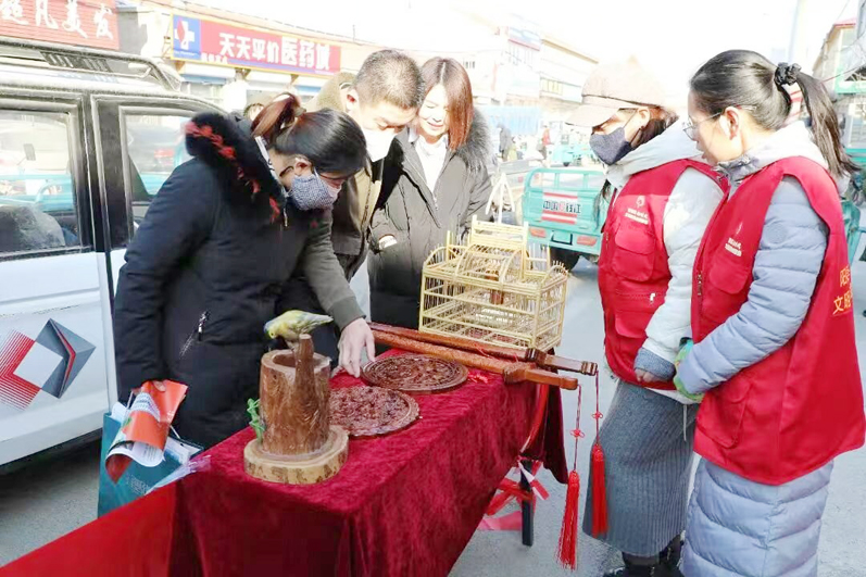 集市是满满当当的“新春”味道,脆甜的本地鸭梨、金黄酥脆的油条、颜色鲜艳的花卉、手工编织的盖帘,年货种类全覆盖,名优农品、休闲食品、家居用品、新春年礼等,均可在这里享受一站式服务。活动现场专门设置了“巾帼共富”非遗文化产品展览摊位,志愿者们耐心地向大家宣传讲解根雕、手插鸟笼制作技艺、剪纸等非遗文化的特点和传承情况,让大家对劳店民间非遗文化有了进一步的了解和认识,丰富了群众文化生活,让劳店非遗文化“活”起来。