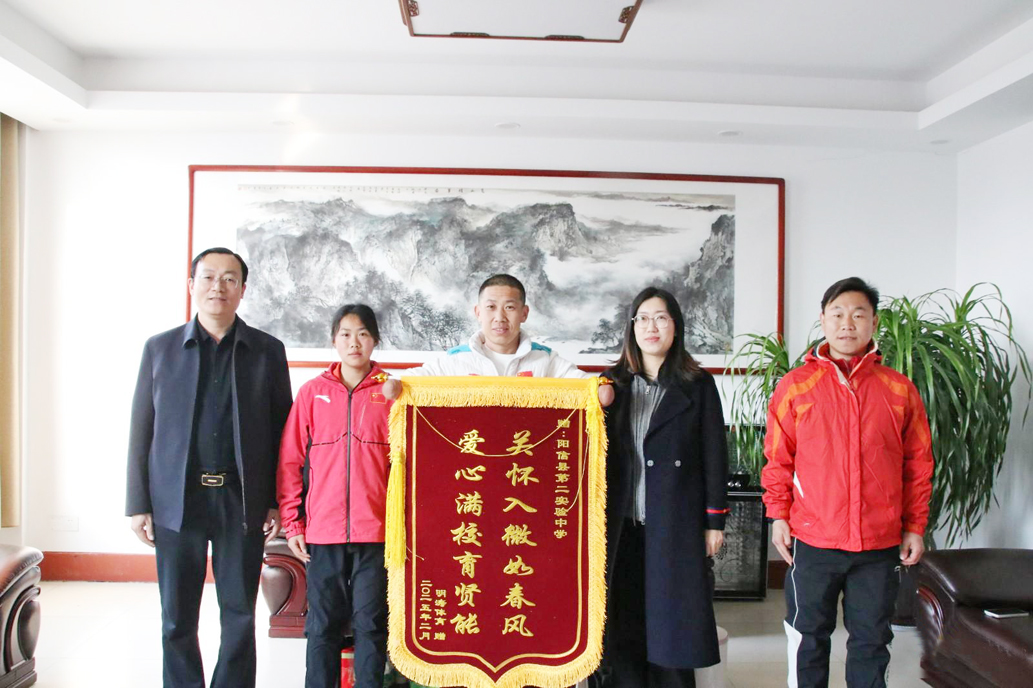 本报讯 2月26日,知名残疾人运动员、阳信县肢残协会主席、阳信县明涛体育训练中心负责人马明涛一行,怀着满满的感激之情,专程来到阳信县第二实验中学,将精心制作的锦旗赠送学校,以表达长期以来学校对残疾人群体关心关怀的衷心感谢。