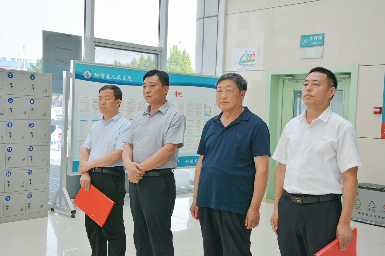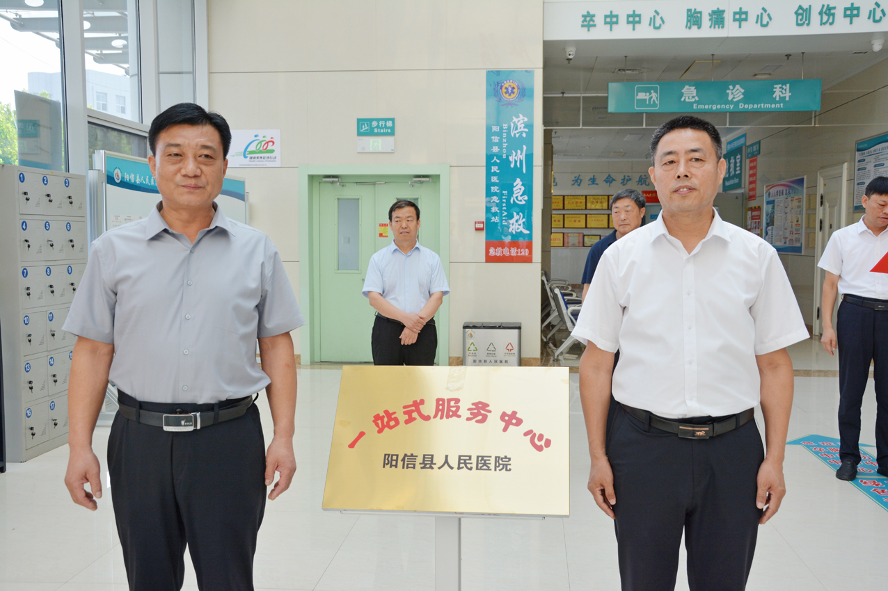 阳信县卫健局党组书记、局长,县中医药管理局局长张勇和县医保局党组书记、局长杨汝峰为“一站式服务中心”揭牌。阳信县人民医院副院长黄树红与山东省阳信春晖物业管理有限公司董事长王俊卿为“阳光陪护驿站揭牌”。