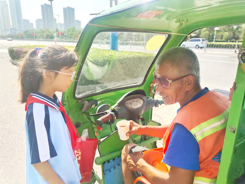 活动现场,孩子们捧着温暖的杯子,穿梭在街头巷尾。他们走向正在分拣包裹的快递员,轻声说"叔叔,喝杯绿豆汤解解暑";来到修剪草坪的老人身旁,踮脚递上杯子"爷爷,歇会儿再干吧";遇到小区保安、环卫工、小吃摊摊主、执勤人员……每一次递出杯子的动作,都带着少先队员特有的真诚与热忱。