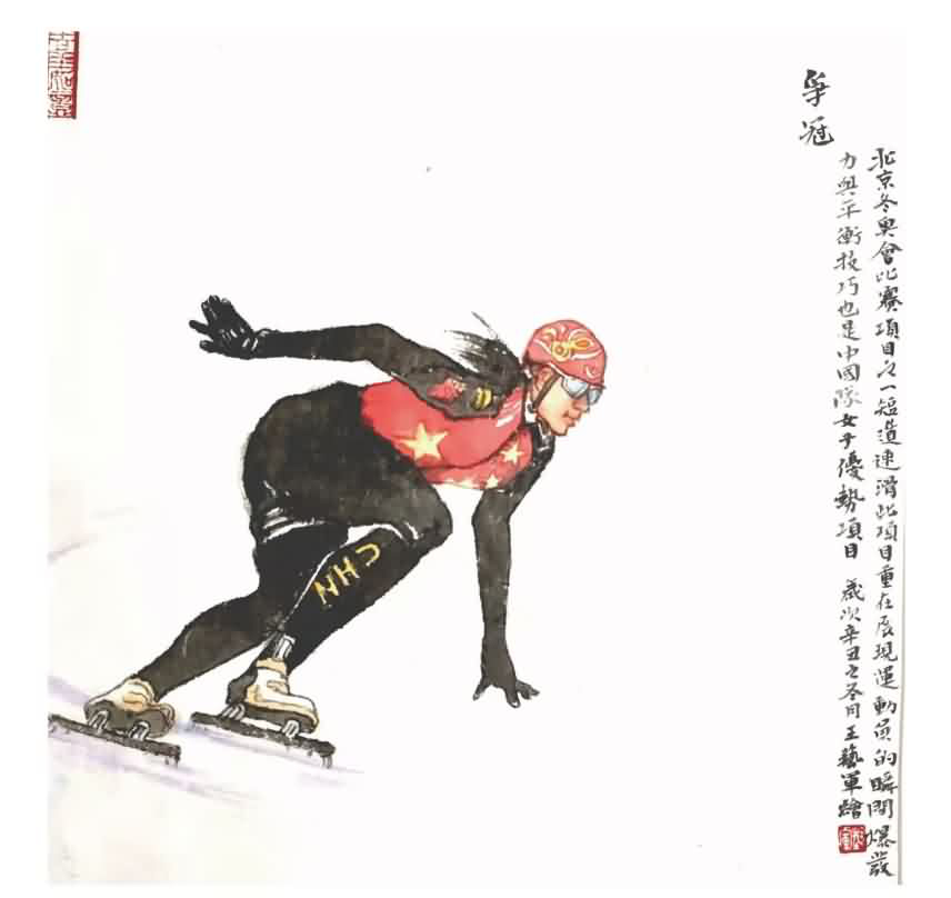 本次创作的冬奥系列作品共有8幅,取材于冬奥会项目。分别是跳台滑雪,单板滑雪、自由式滑雪、短道速滑、花样滑冰、冰球、滑雪射击、钢架雪车。画作把冬奥项目展现地淋漓尽致,人物灵动。并都为项目进行了名词解释,其中在短道速滑画作上题词:争冠,此项目重在展现动员员的瞬间爆发力与平衡技巧,也是中国队女子优势项目。