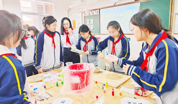 本报讯 近日,在县第一实验学校的劳动课堂上,初一年级的少先队员们正手持自制漆扇,在流光溢彩的纹样间感受了匠心传承。这堂别开生面的“非遗漆扇制作”课,正是该校“五育融合”视域下少先队“1413+N”特色劳动校本课程的生动实践。