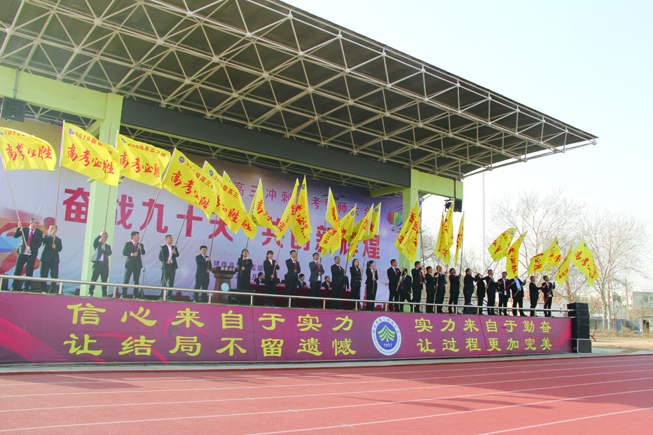 各班班委成员在战旗上庄重地签下自己的名字和理想大学,随着朱洪彬校长向全场发出高考冲刺动员令,全体师生举起右臂,握紧拳头,带着对未来的憧憬、带着师长的祝福、带着决战高考的斗志与豪情庄严宣誓,誓言字字千钧,掷地有声,环绕会场,久久不绝。