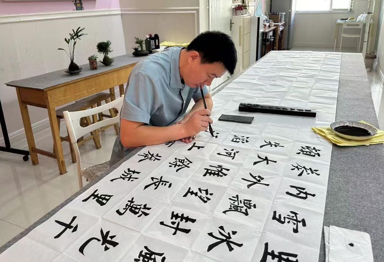“在多年的创作中,我始终坚持高举旗帜,培根铸魂,做到与时代同步、与人民同行,坚持正确的政治方向。”他说到做到,作品多次在中国书法家协会举办的展赛活动中入选获奖,先后加入山东省书法家协会、山东省青年书法家协会。2021年10月,作为全县唯一人选,加入中国书法家协会,成为全县书法家领军人物,个人书法事迹被《中国文艺家》报道,《美善》等作品被上海廿一收藏馆收藏。《庄子》选篇、《颜氏家训》节录等作品先后入选中国楷书年展前100名、中国第五届正书展、全军庆祝改革开放40周年书法展等国家级展览;《古文观止》选篇、《屈原列传》等作品入选山东省书法家协会主办的“墨子文化奖”全国书法作品展、贵州省“税收带来祖国美”全国书法大展、全国法治书画摄影展、首届“书圣故里、魅力琅琊”全国书法篆刻展、首届“大美徐州、魅力云龙”全国书法展、滨州市十一届临帖大展、首届“尊享瑞园杯”全国书法大展、2019金芦苇奖·白洋淀·书法·绘画·摄影作品大展。2022年在山东省书法家协会主办的“山东省书法临帖作品展”中,作品《道因法师碑》被选为入展作品。2024年参加山东农担公司书画摄影暨廉洁文化作品展,作品《强军之道》荣获书法类作品一等奖。