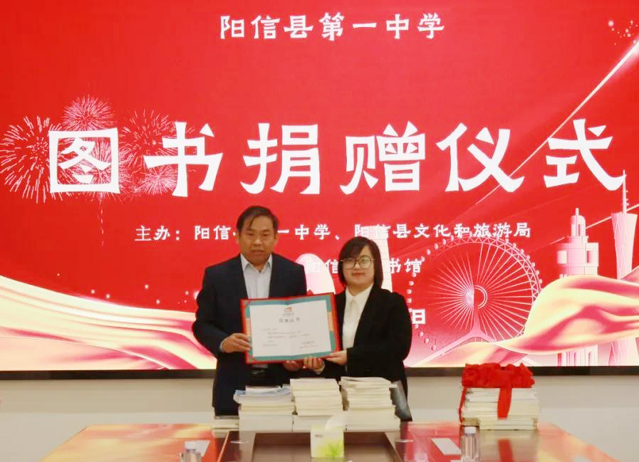 高敏首先对阳信一中的捐赠表示由衷的感谢,本次捐赠活动,不仅扩充阳信县图书馆的图书储备,优化馆藏结构,同时彰显了阳信县第一中学对地方文化建设的支持和社会担当精神。高敏还向一中颁发地方文献捐赠证书。