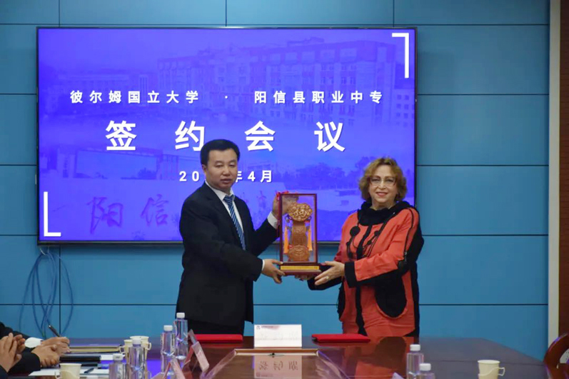 彼尔姆国立大学驻华留学生服务中心主任潘建鹏,对彼尔姆国立大学的中外合作培养模式以及留学中心提供的全方位服务进行了深入的讲解。在双方代表的见证下,阎汝强同塔季扬娜教授签订了战略合作协议。仪式上,塔季扬娜教授代表彼尔姆国立大学为县职业中专授予 “彼尔姆国立大学优质生源基地” 牌匾。双方还互换了具有纪念意义的礼物,并合影留念,为这一重要时刻留下了珍贵的回忆。