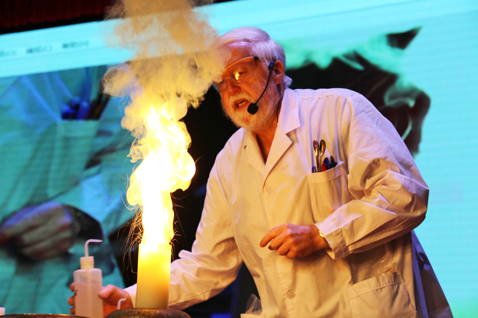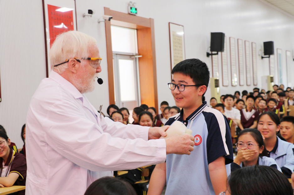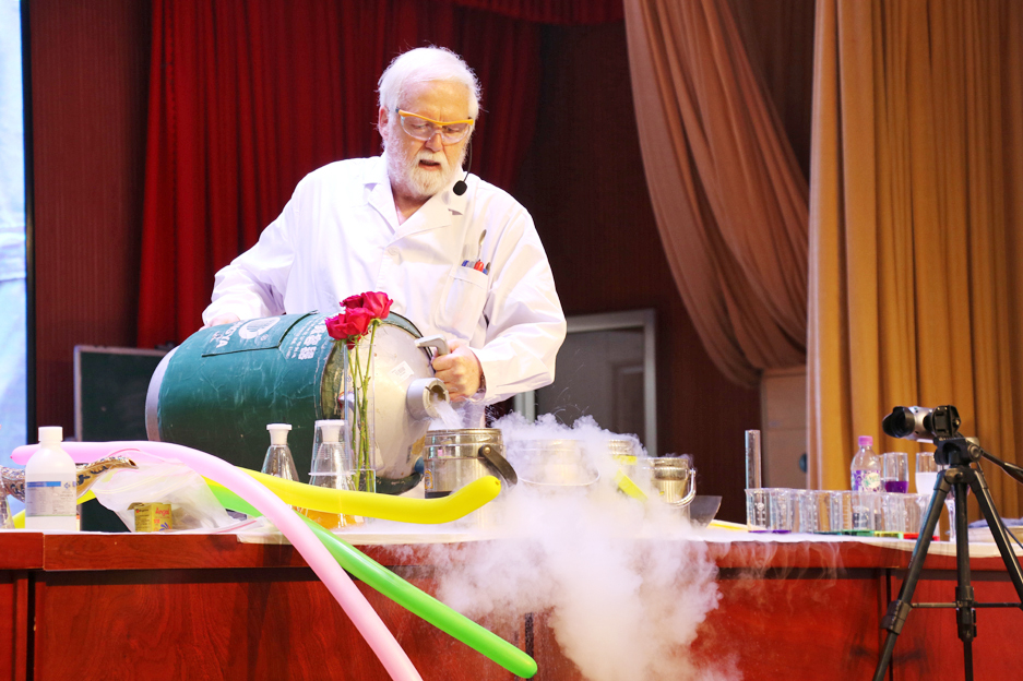 戴维教授利用液氮让我们看到了零下196℃液氮中,玫瑰花瞬间冻结却保持鲜艳的“玫瑰冰雕”、还有冷冻后变得坚硬无比的“钢铁香蕉”,但是小蛇布偶看起来却毫发无伤,依旧能灵活扭动。戴维教授解释道,液氮的低温使水分子瞬间结冰,物品硬度变大,小蛇布偶中没有水分子,所以依旧能保持柔软。戴维教授特别强调:“这些看似“魔法”的现象全是物理变化!物质状态改变时,水分子本身并未分解——化学变化需要新物质生成。”通过一系列生动有趣的案例和实验,向同学们展示了化学在日常生活中的应用及其背后的科学原理。
