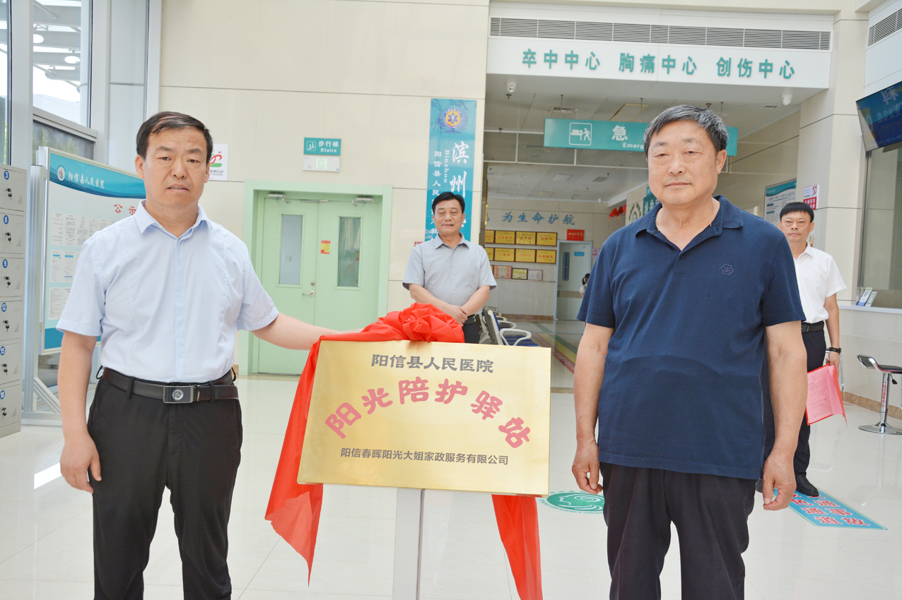 阳信县卫健局党组书记、局长,县中医药管理局局长张勇和县医保局党组书记、局长杨汝峰为“一站式服务中心”揭牌。阳信县人民医院副院长黄树红与山东省阳信春晖物业管理有限公司董事长王俊卿为“阳光陪护驿站揭牌”。